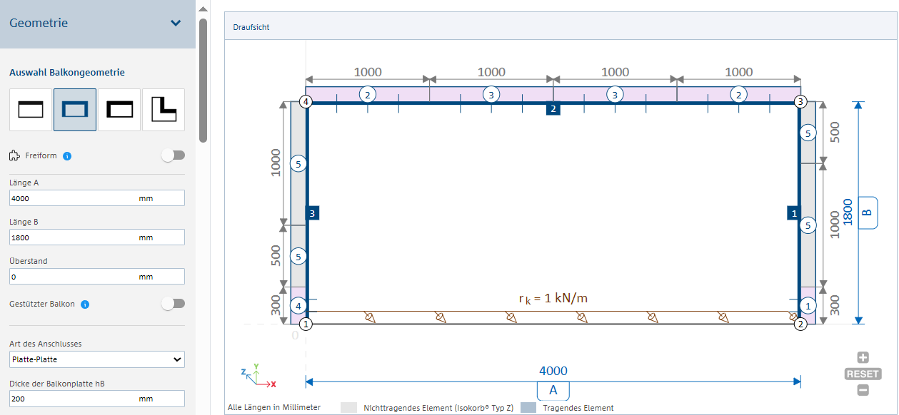 - Wenn Sie mit diesen Einstellungen den Balkon bemessen, so wird ein zwängungsfreier Anschluss erzeugt.